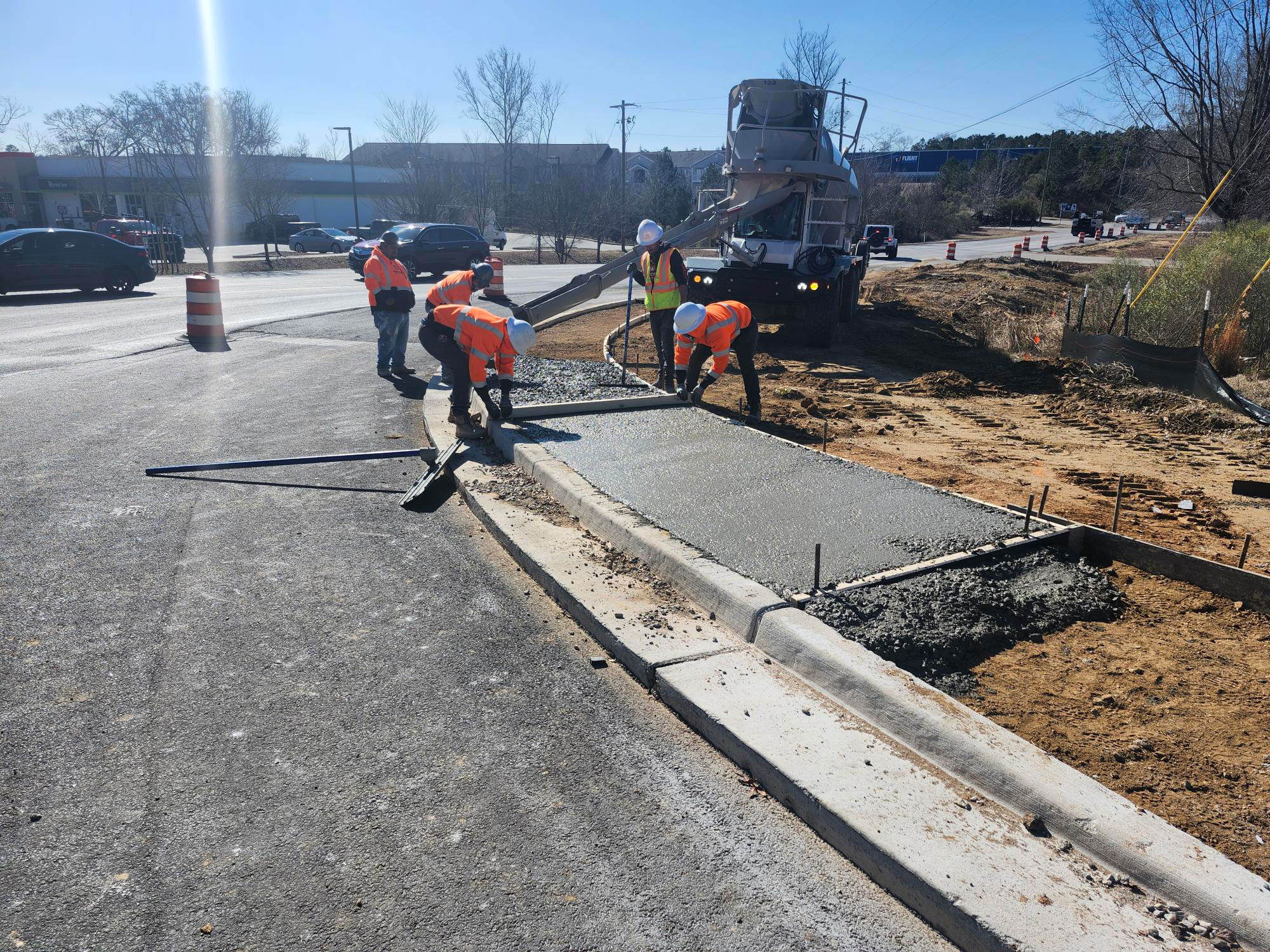Crews install sidewalk along Broad River Road. Pedestrian accessibility will be established along Broad River Road including through the Diverging Diamond interchange.