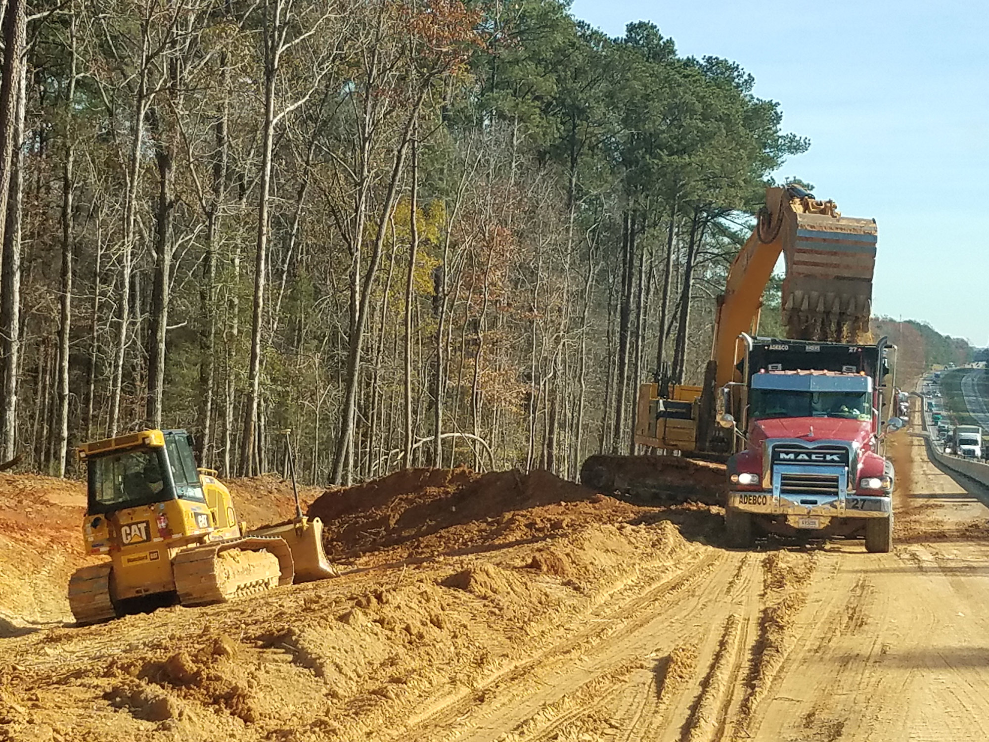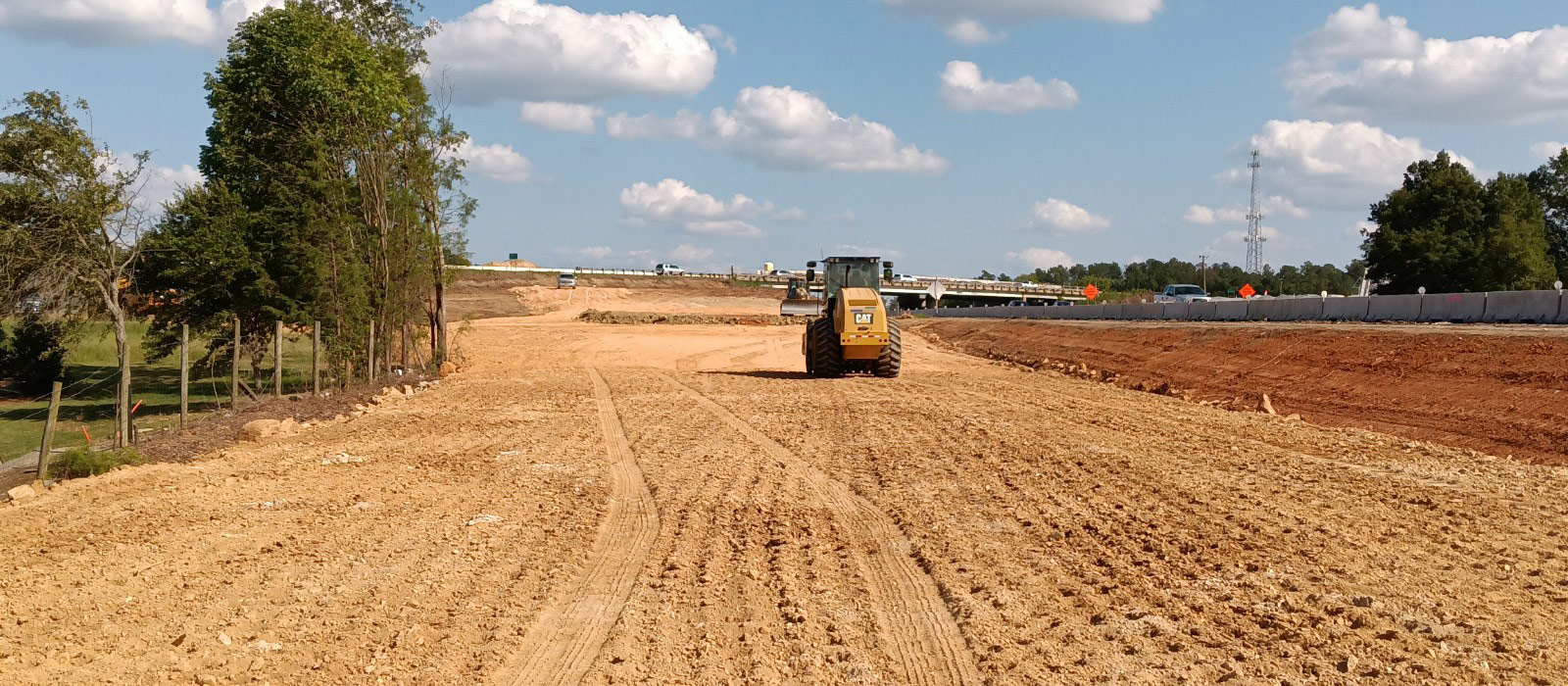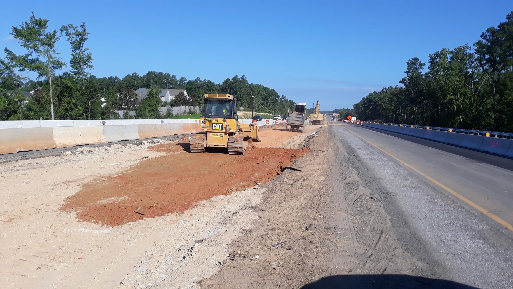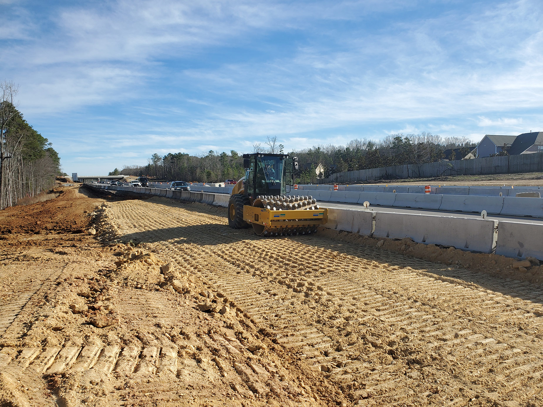 Widening the roadway along I-26 Westbound in Segment 1 of the project. New fill dirt is place and compacted using “sheepsfoot rollers”. This equipment ensures a solid foundation for the future travel lanes.
