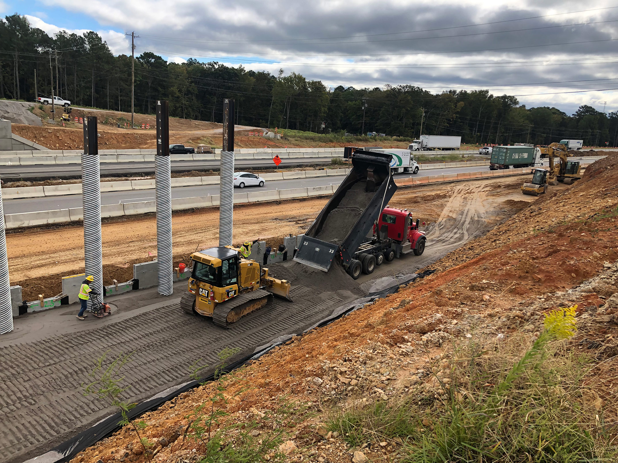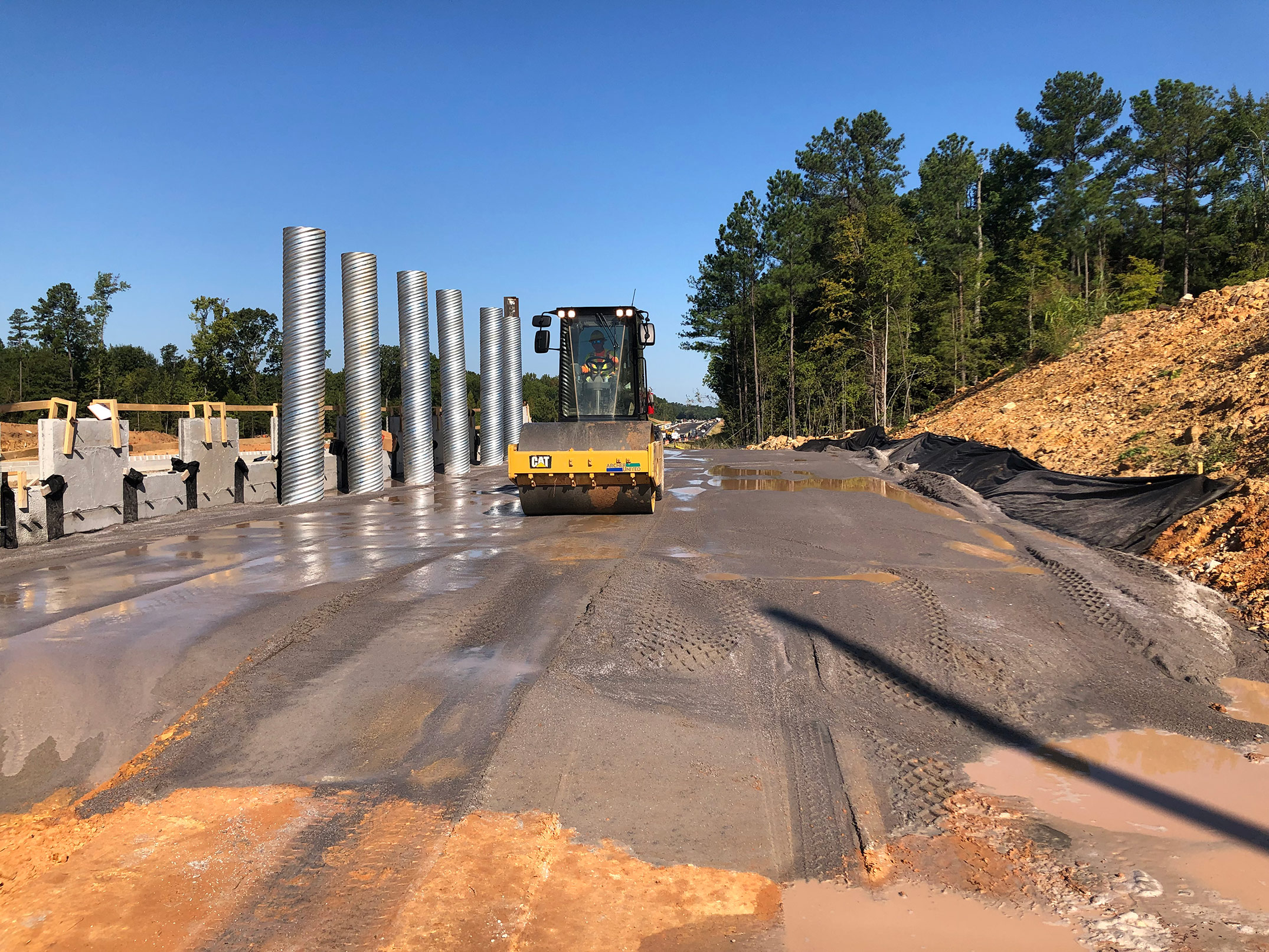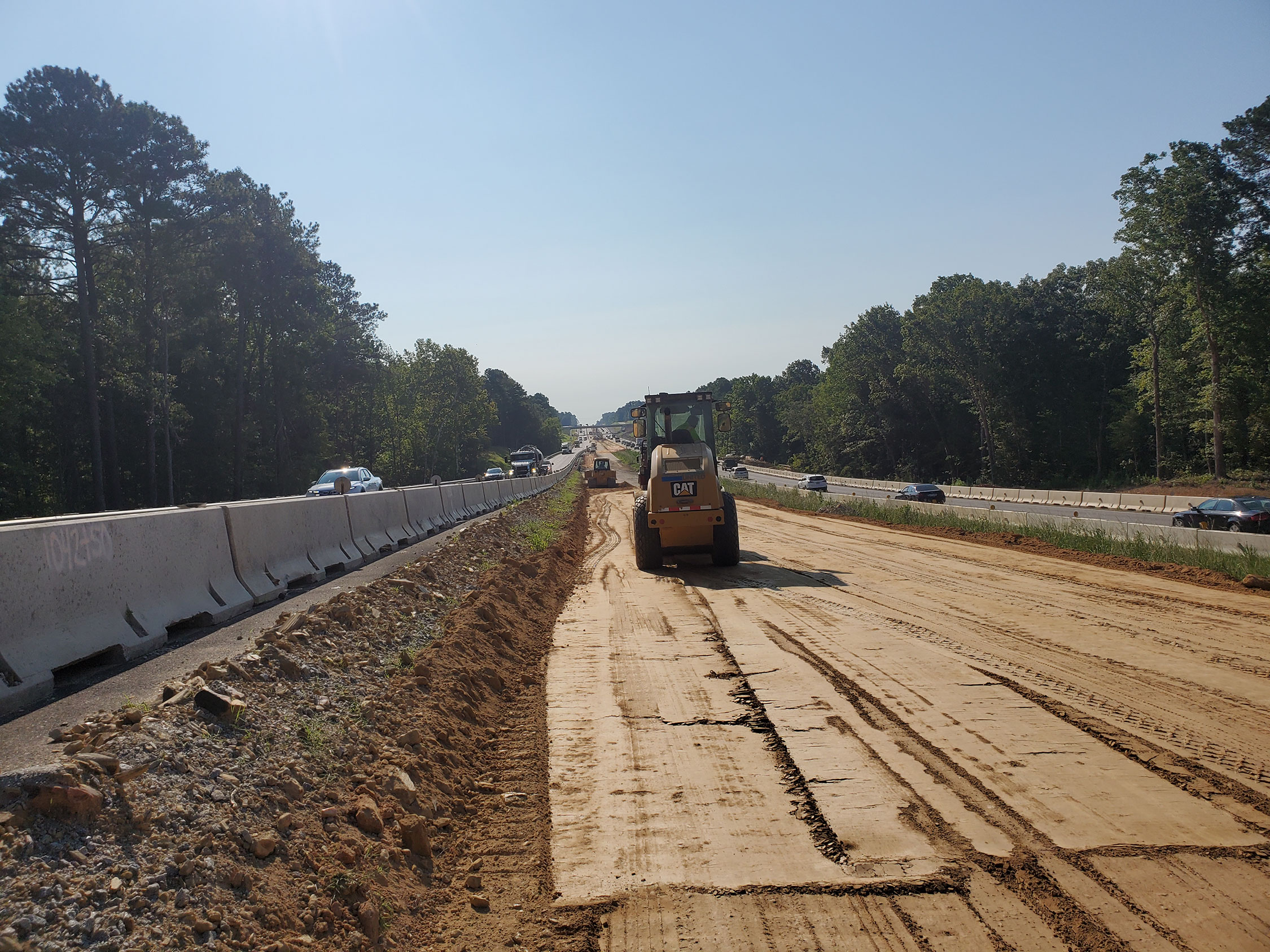 Widening the roadway along I-26 Westbound in Segment 1 of the project. New fill dirt is place and compacted using “sheepsfoot rollers”. This equipment ensures a solid foundation for the future travel lanes.