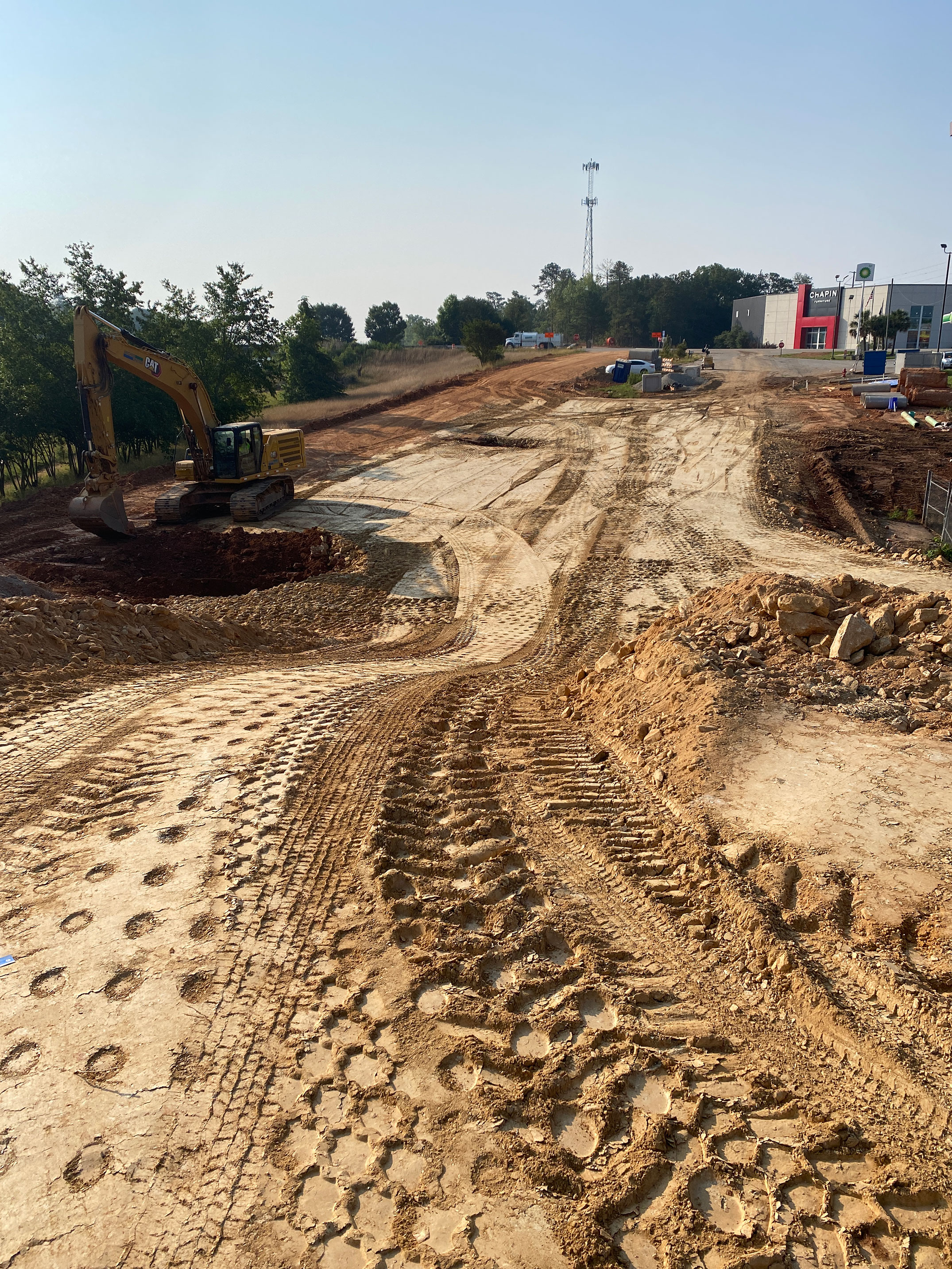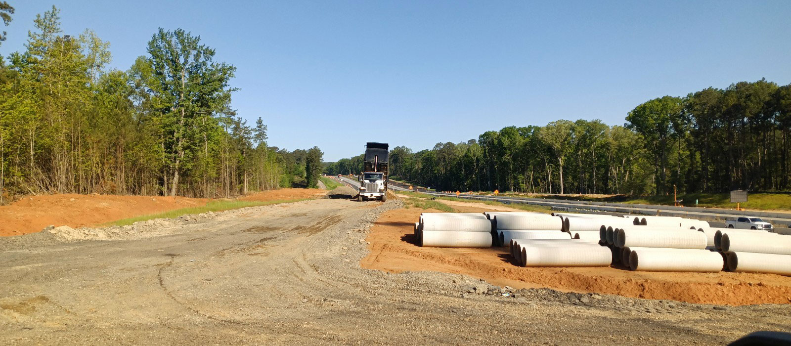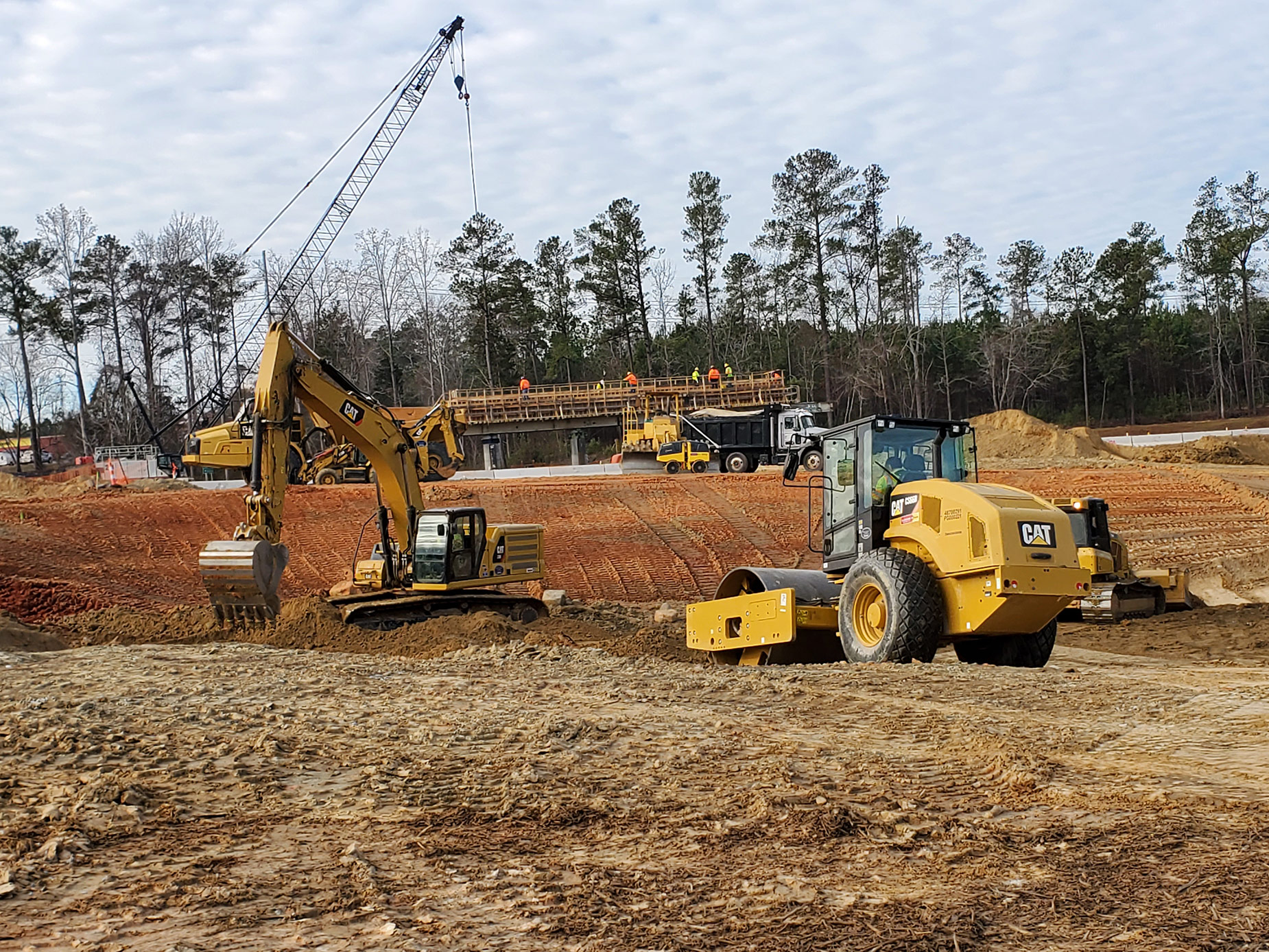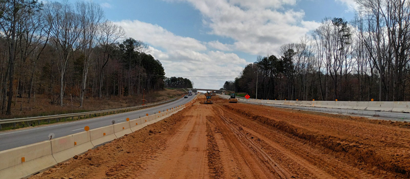 Widening the roadway along I-26 Westbound in Segment 1 of the project. New fill dirt is place and compacted using “sheepsfoot rollers”. This equipment ensures a solid foundation for the future travel lanes.