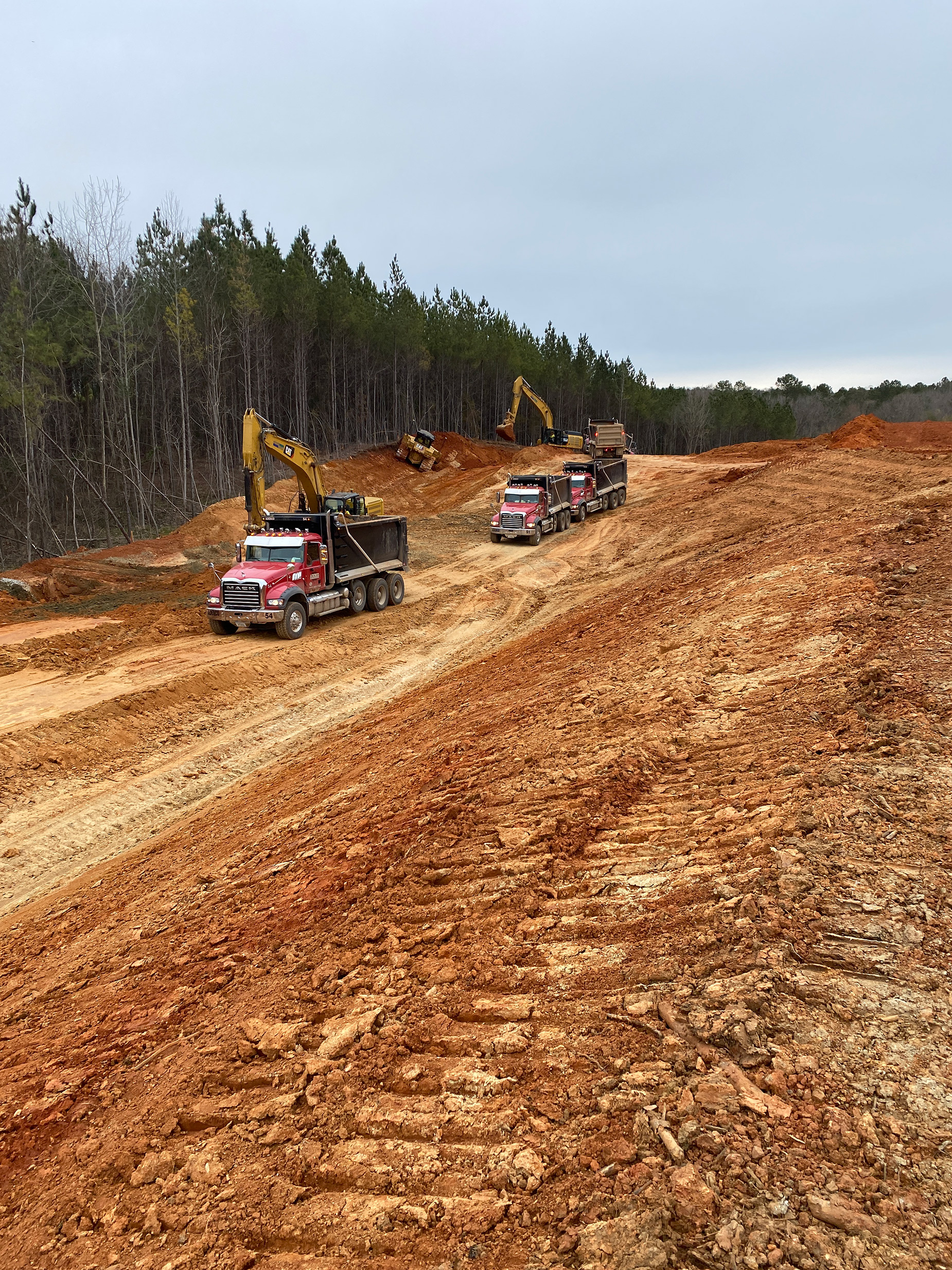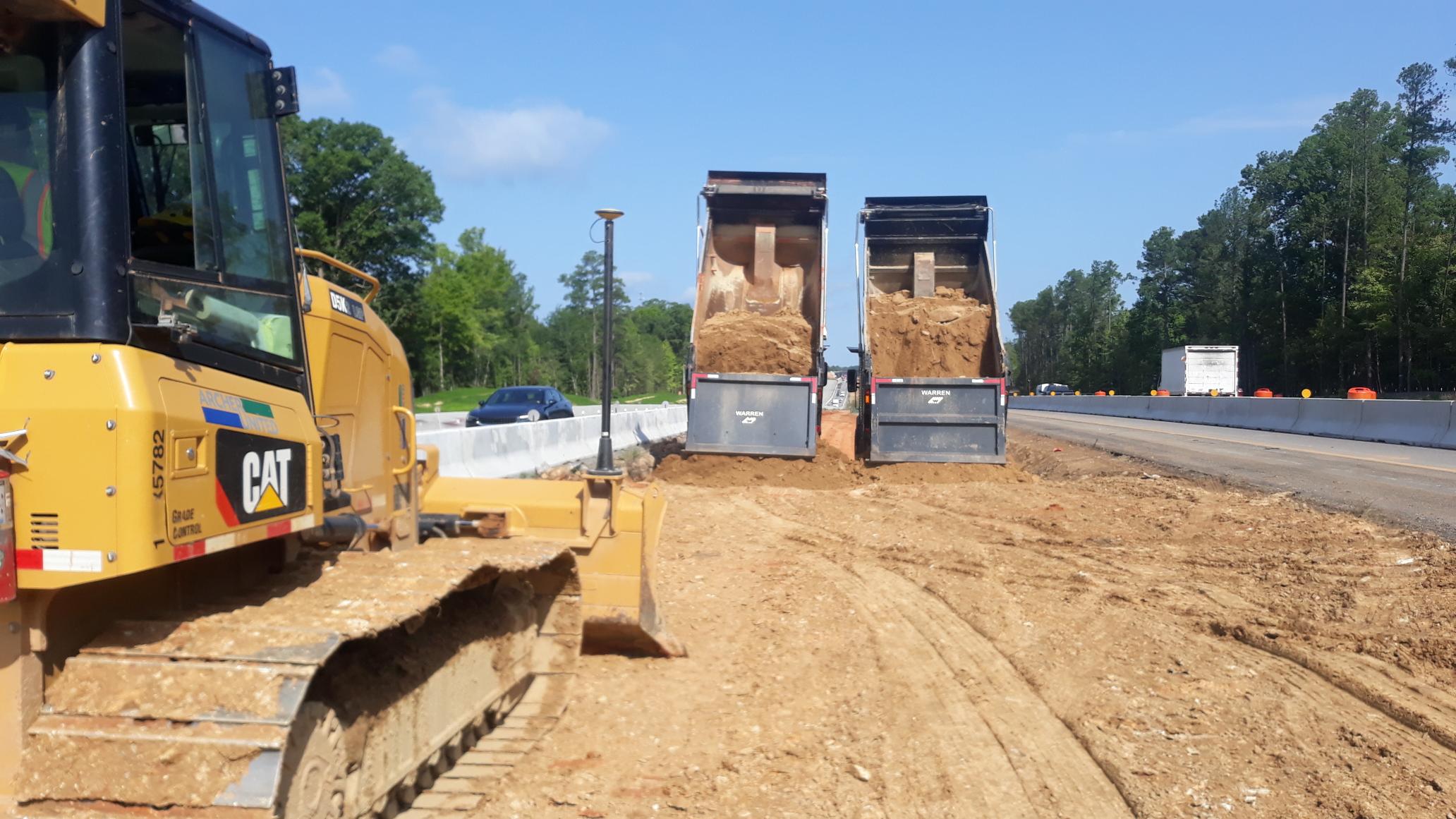 Widening the roadway along I-26 Westbound in Segment 1 of the project. Trucks line up to haul material from the cut sections to the fill sections along the corridor. The widening will allow for four travel lanes in each direction!