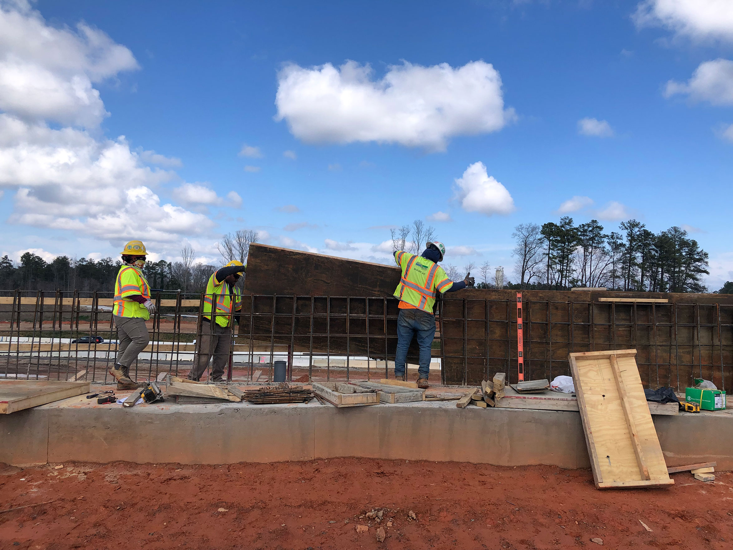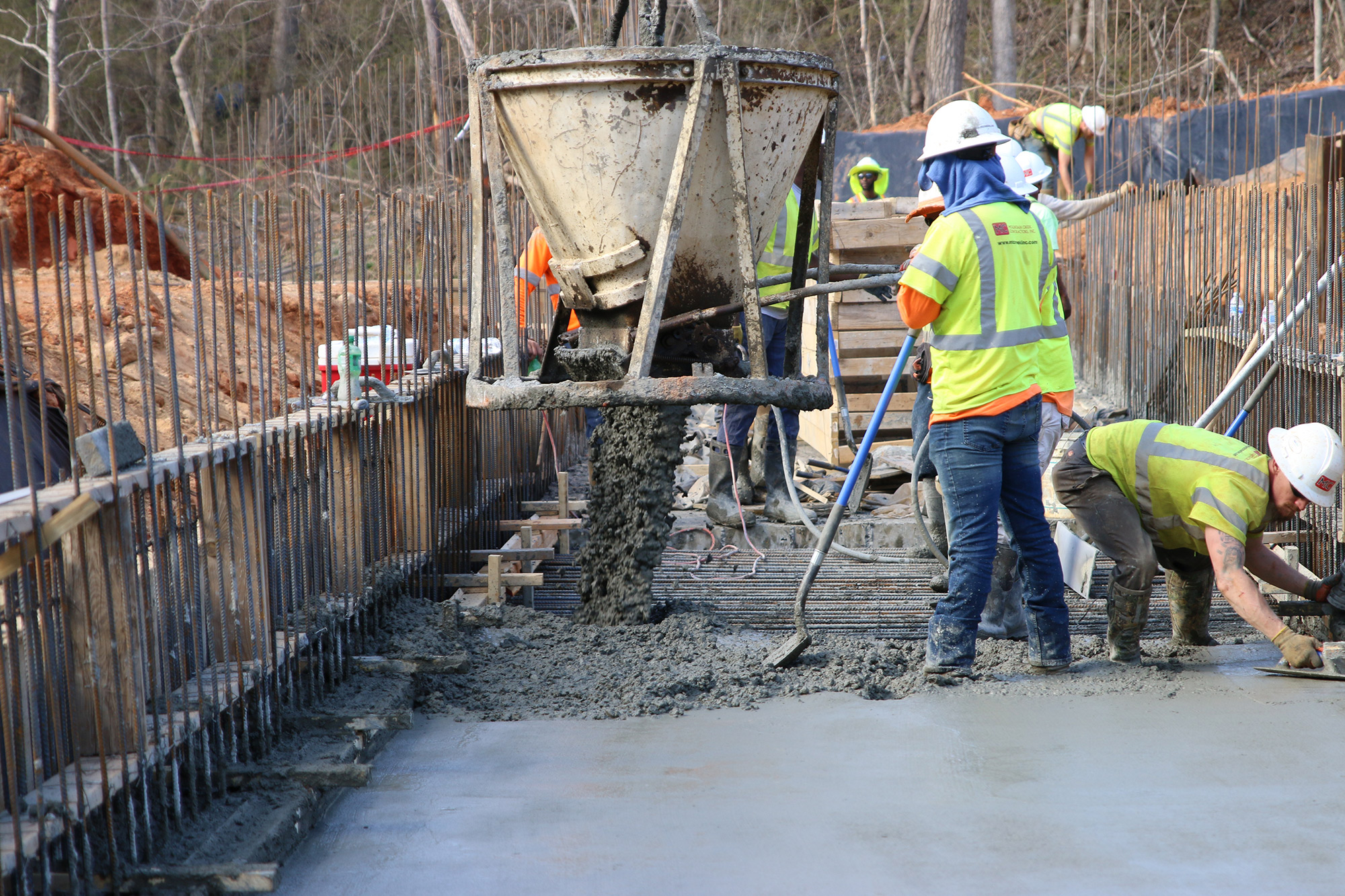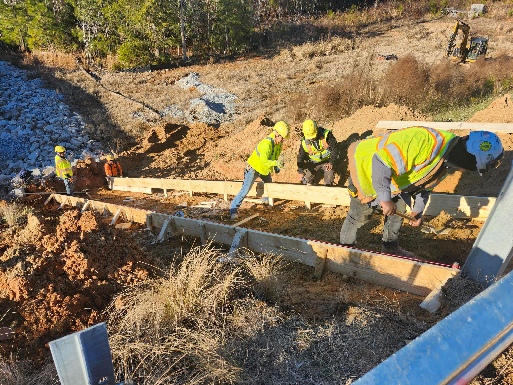 Crews carefully form and pour a moment slab footing along Broad River Road. Survey stakes provide key information to ensure the slab is at the proper location and grade