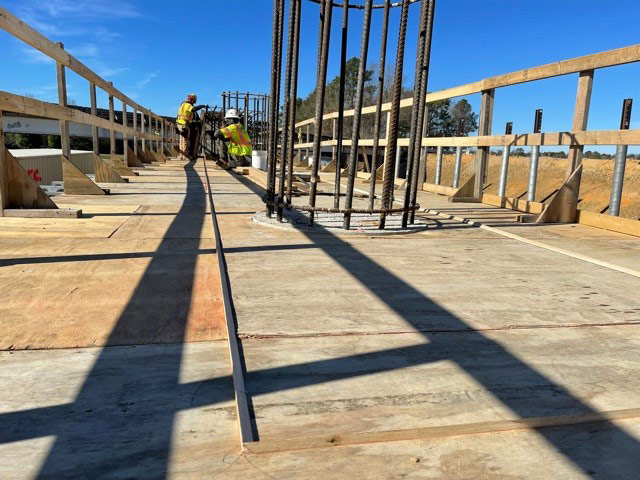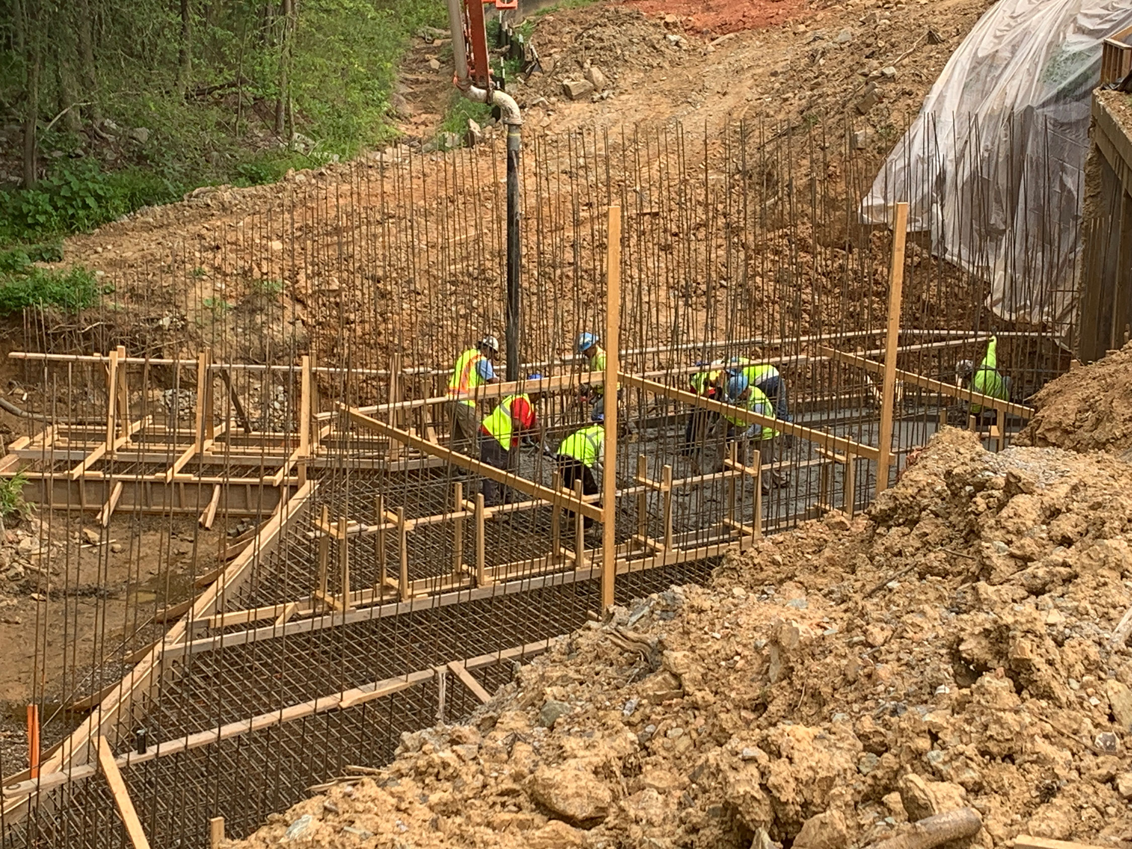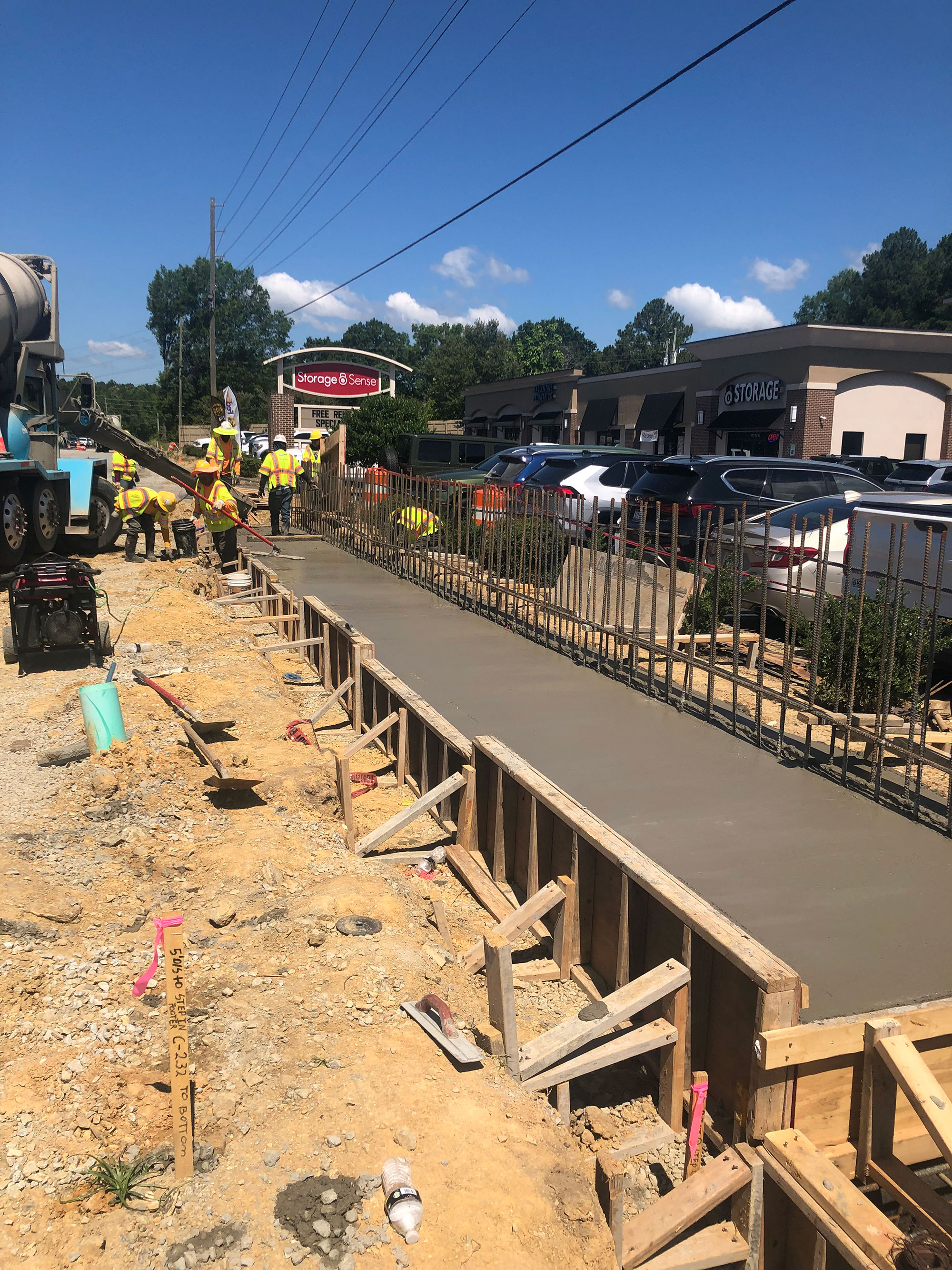 Crews carefully form and pour a moment slab footing along Broad River Road. Survey stakes provide key information to ensure the slab is at the proper location and grade