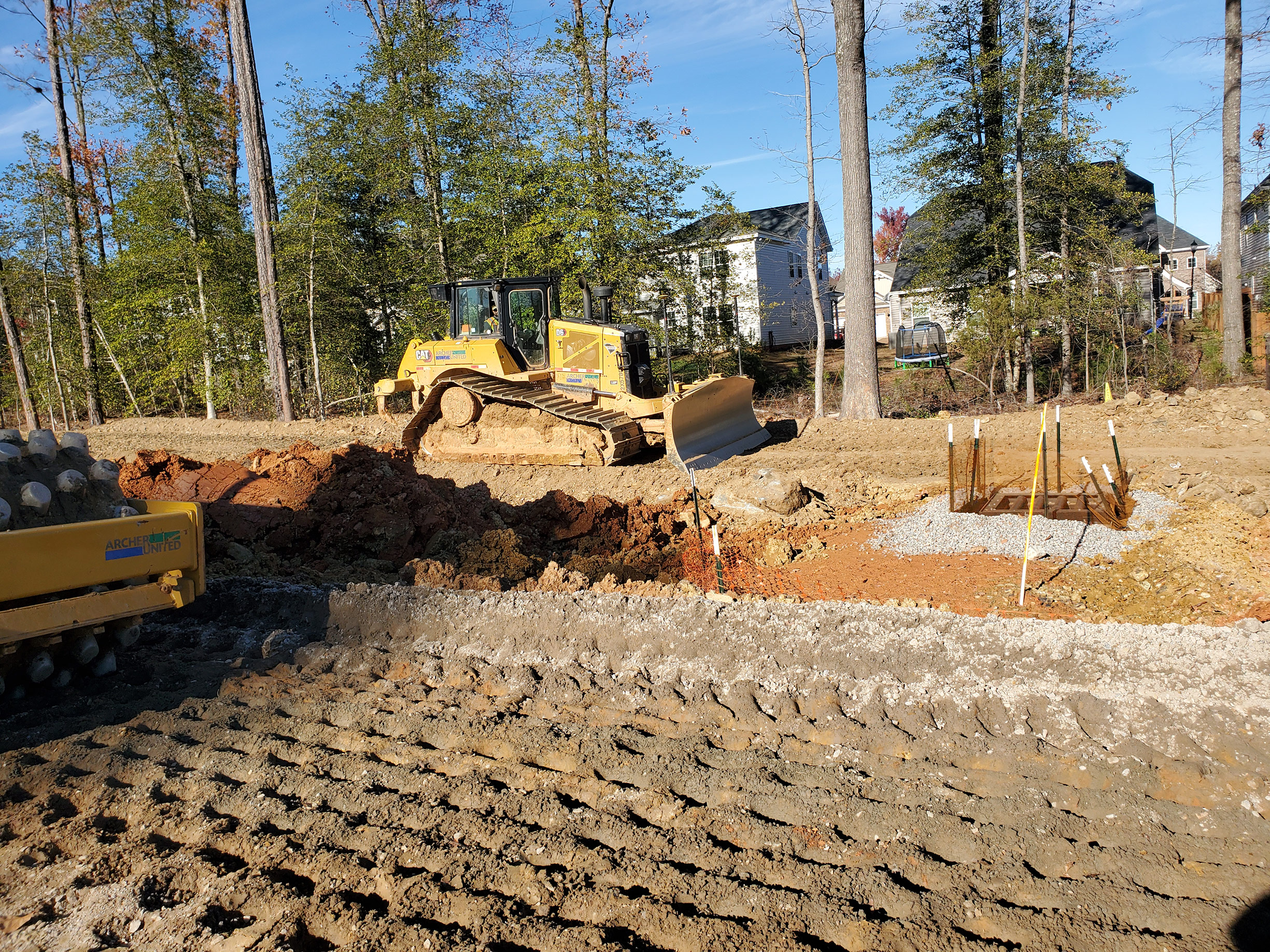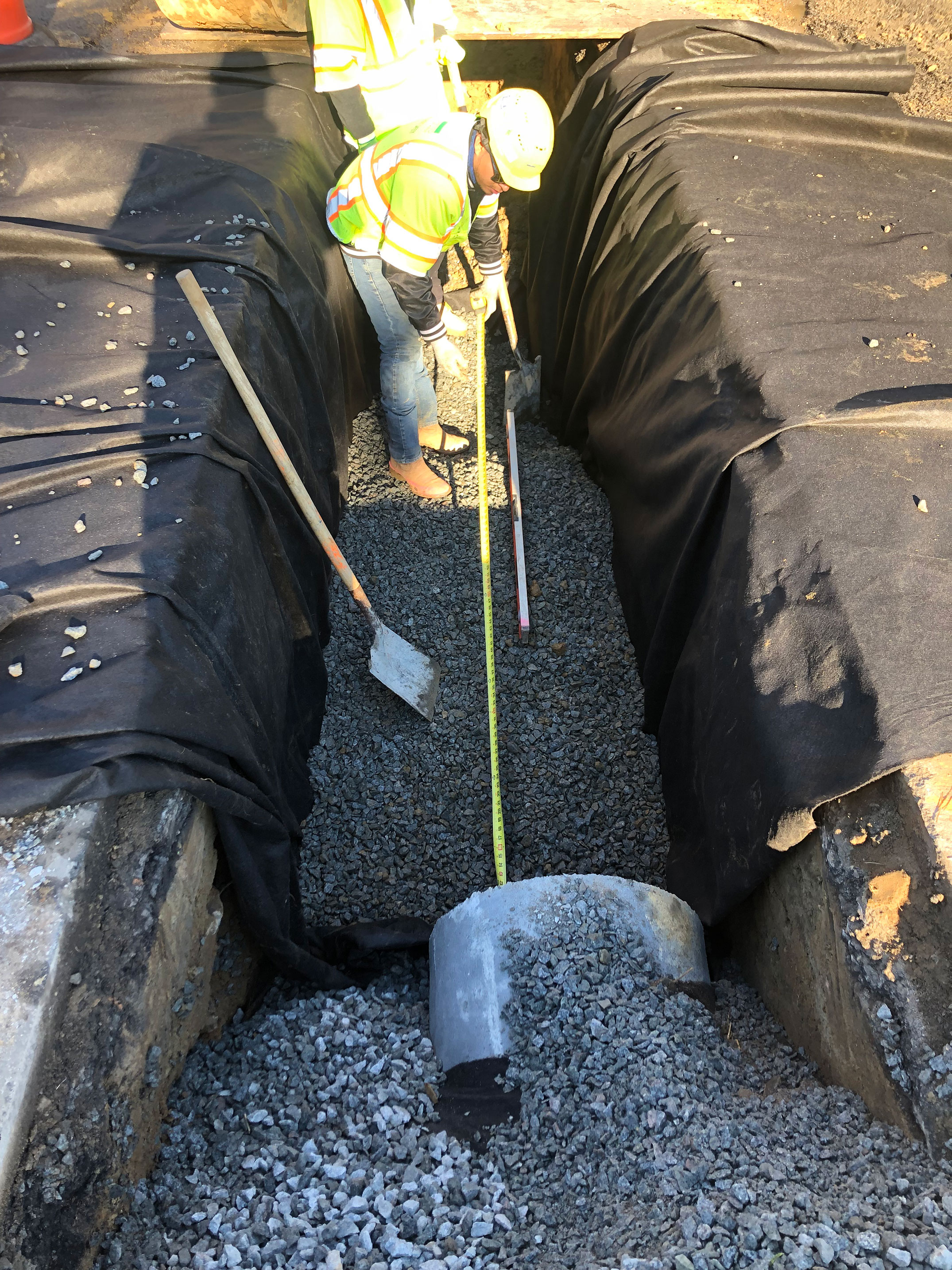 Storm drainage is installed using coarse aggregate for bedding. The bedding is wrapped in geotextile fabric to create a stable pipe trench.