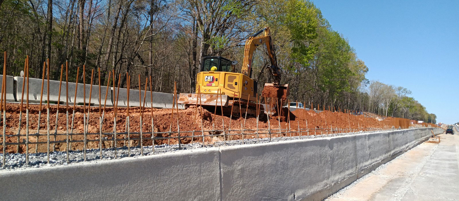 This photo shows construction of the retaining wall on the eastbound side of the I-26 for the future Columbia Avenue overpass at Exit 91. Panels for the wall are secured in place with metal straps that are encased in compacted backfill.