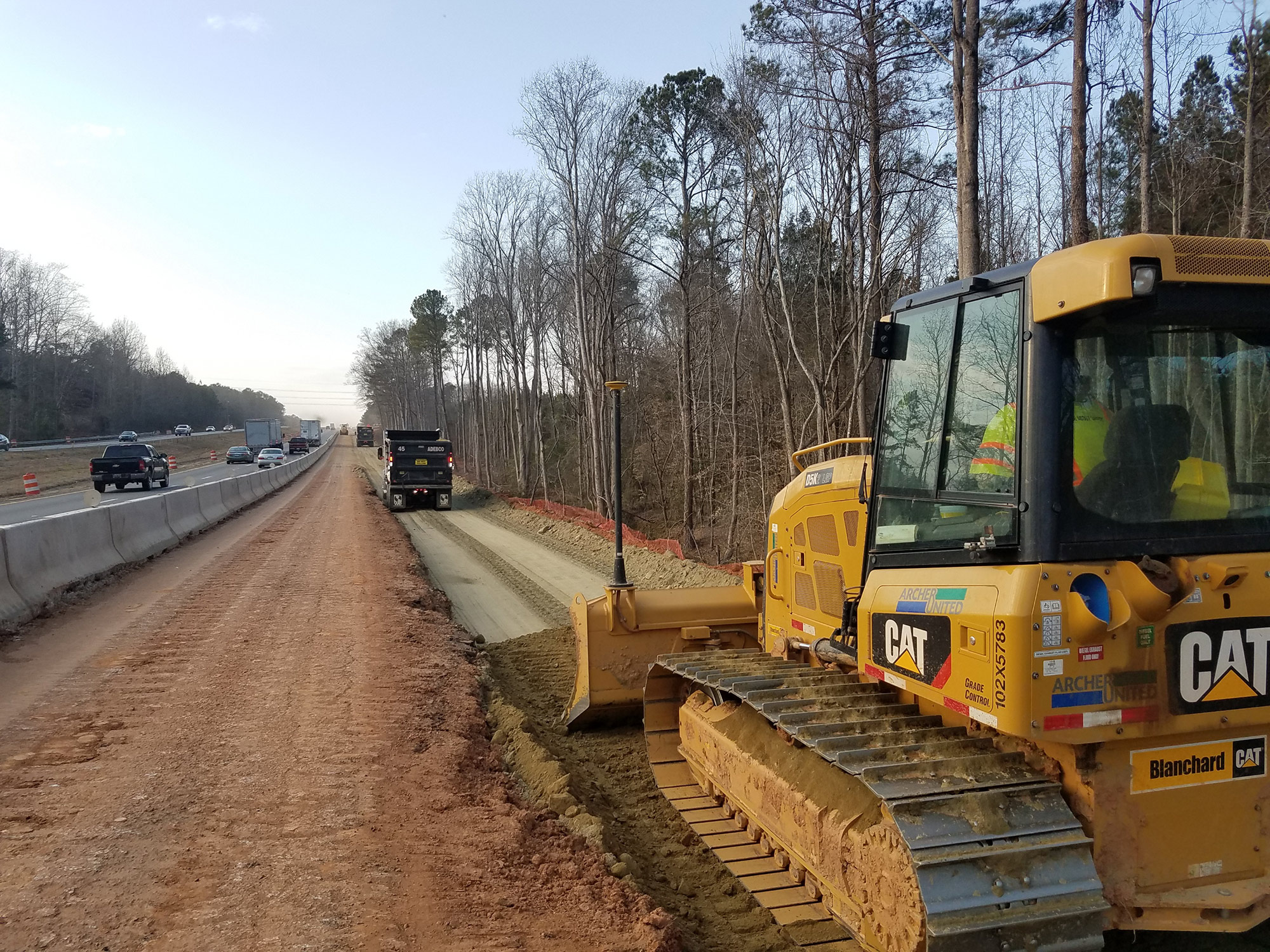In this photo, the contractor utilizes state of the art surveying equipment to automate the fine grading operation along I-26 near Shady Grove Road.