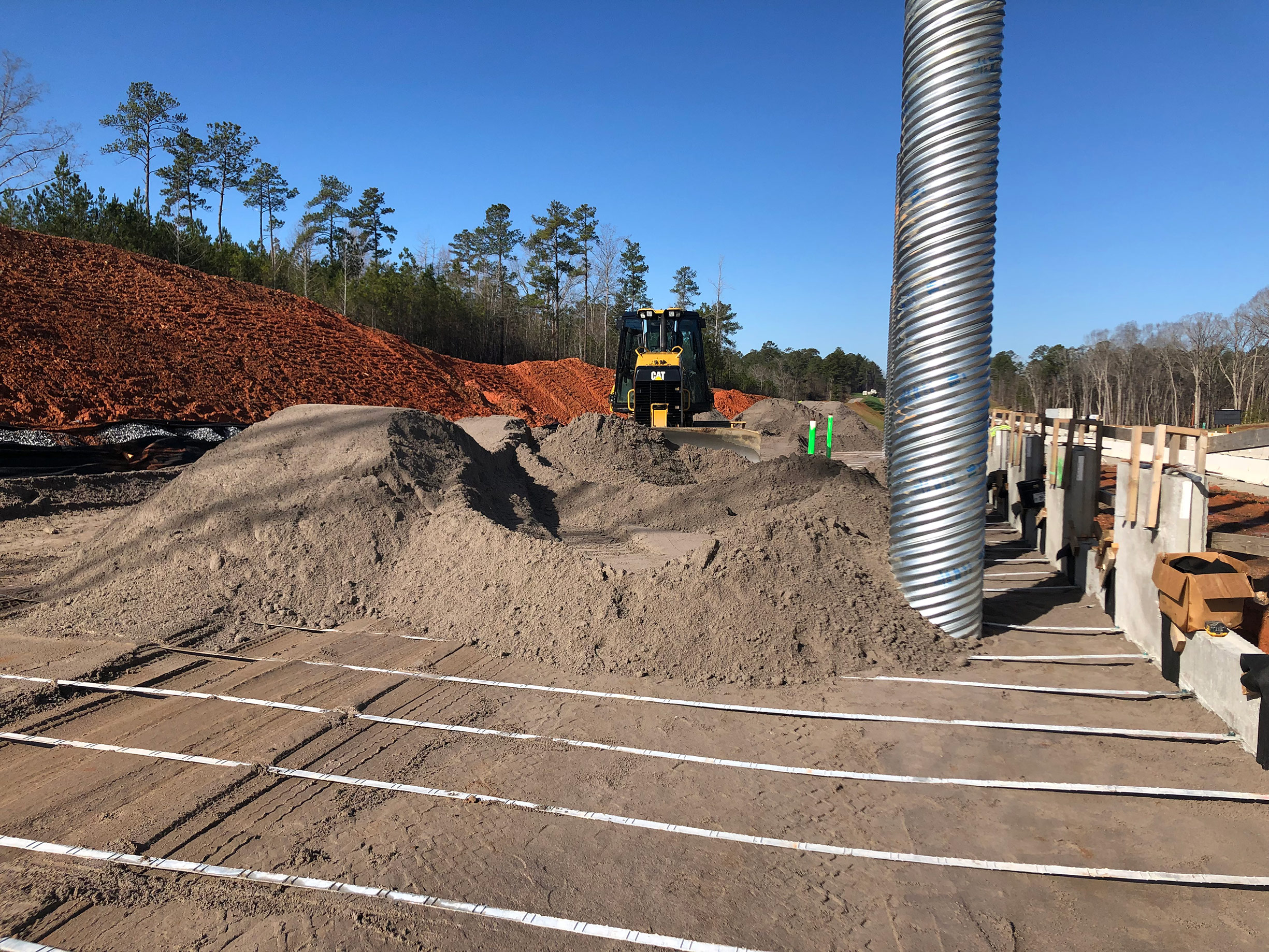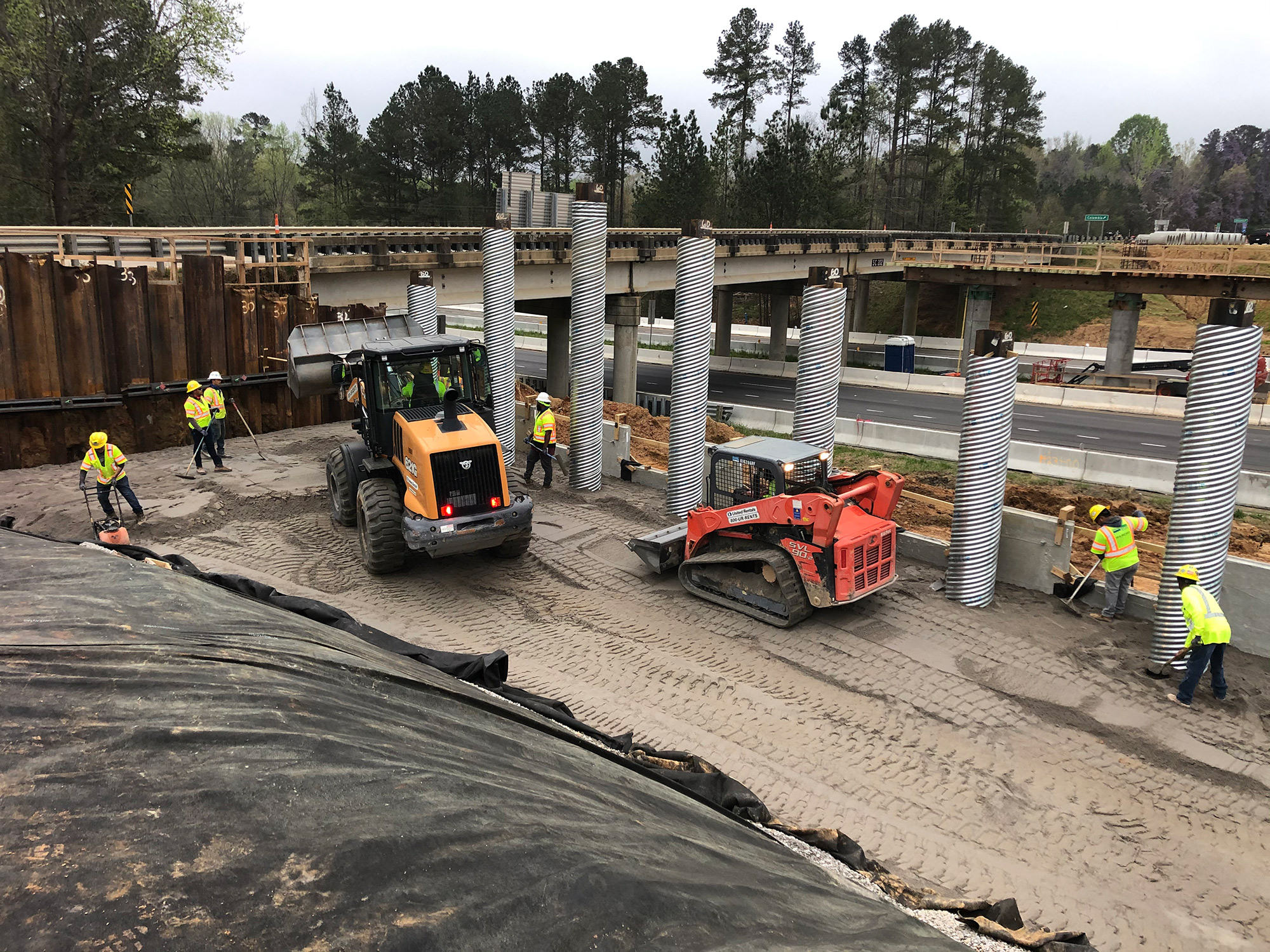 Men and equipment placing backfill for the retaining wall at the SC-202/Exit 85 overpass. Steel piles that will support the future bridge are protected with spiral ribbed steel cans during the placement of the select backfill material.