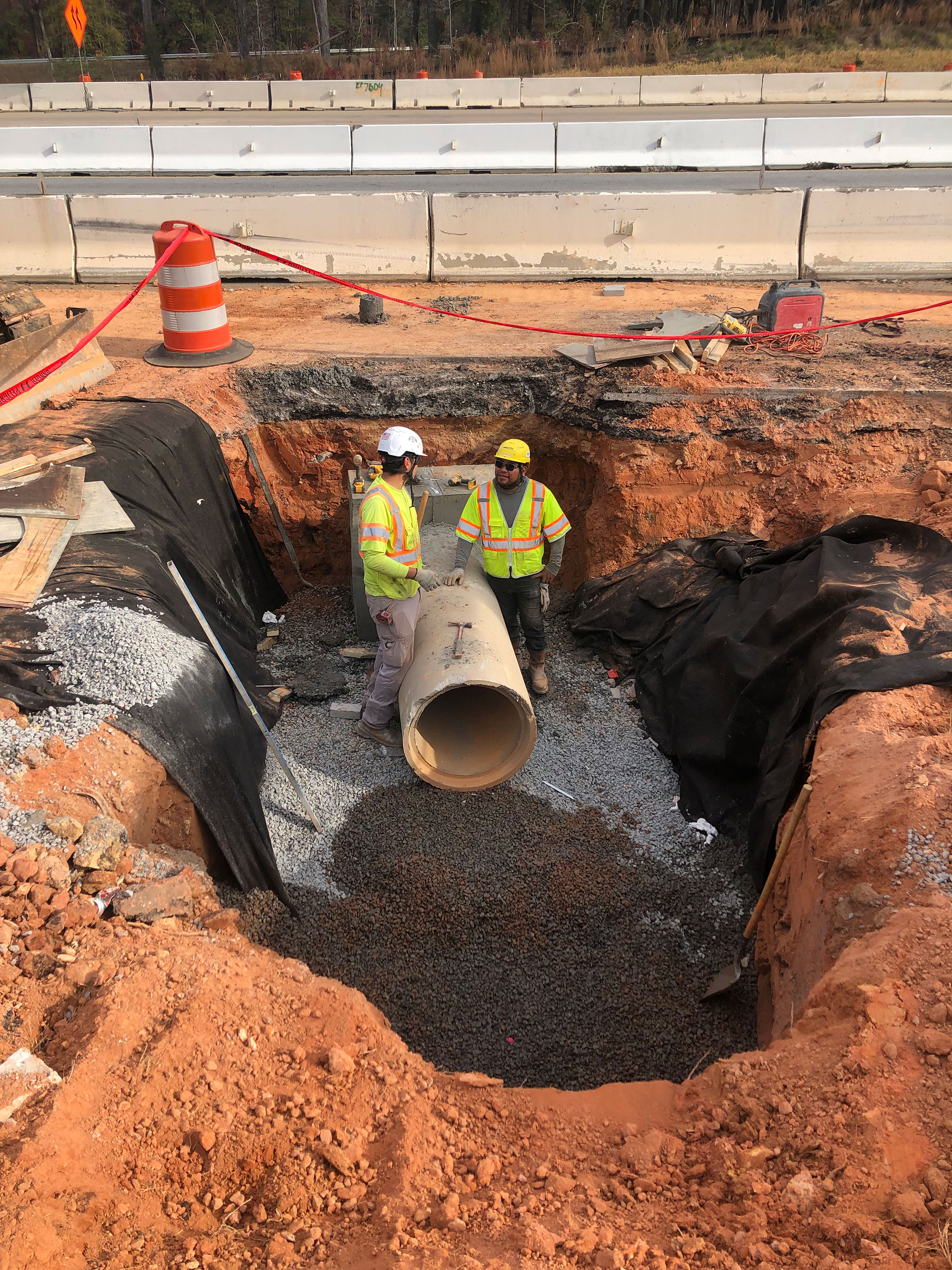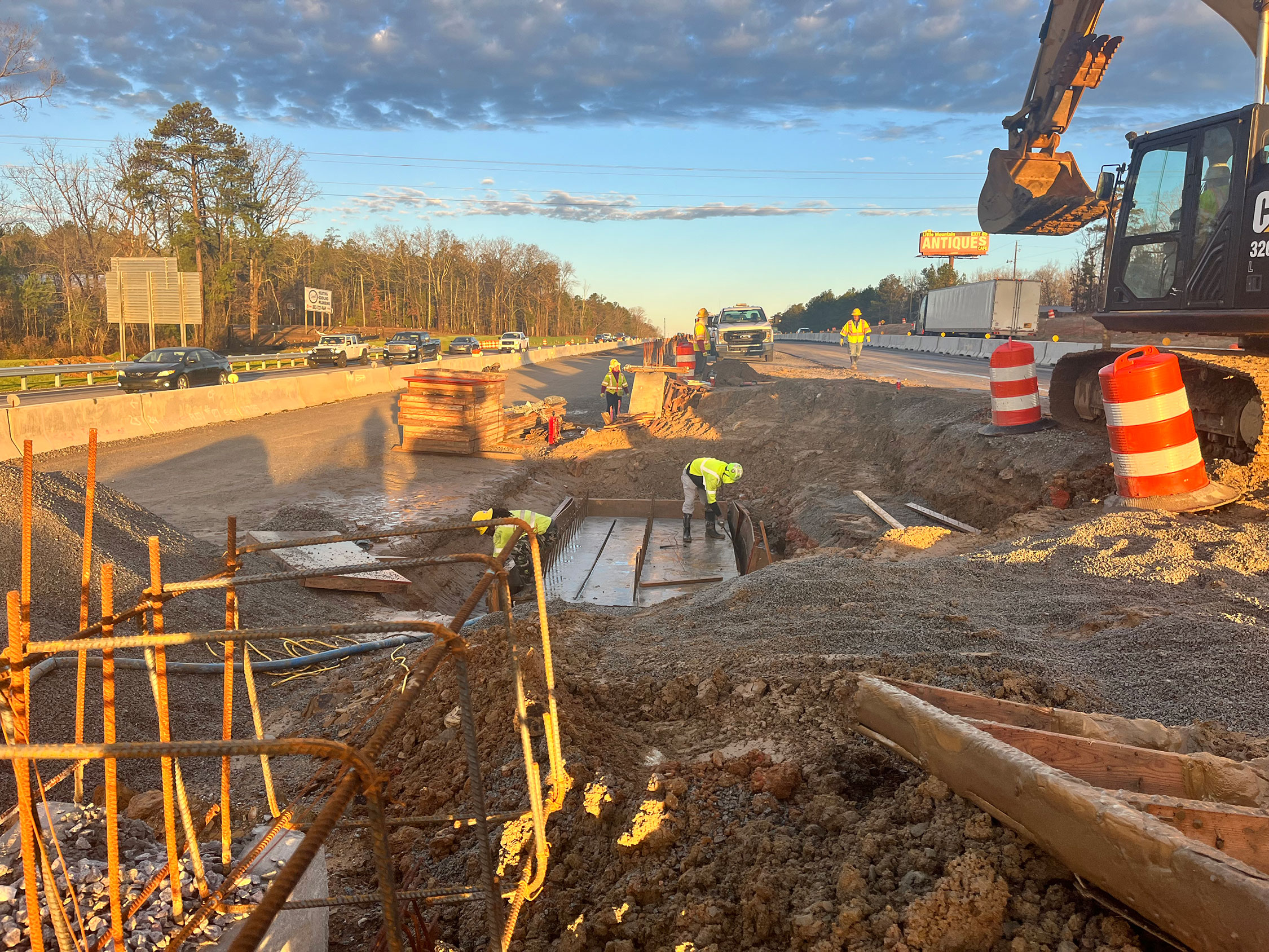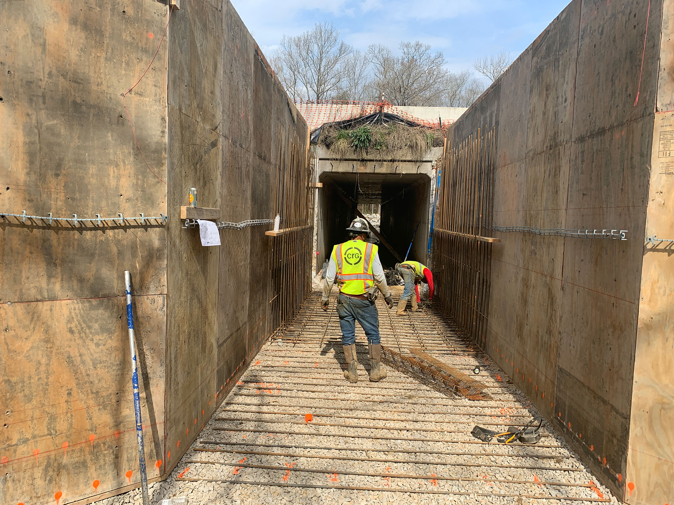 There are over 20 box culverts that run underneath I-26. Each of these culverts has to be extended to accommodate the roadway widening. Here workers are placing reinforcing steel for one of the extensions.