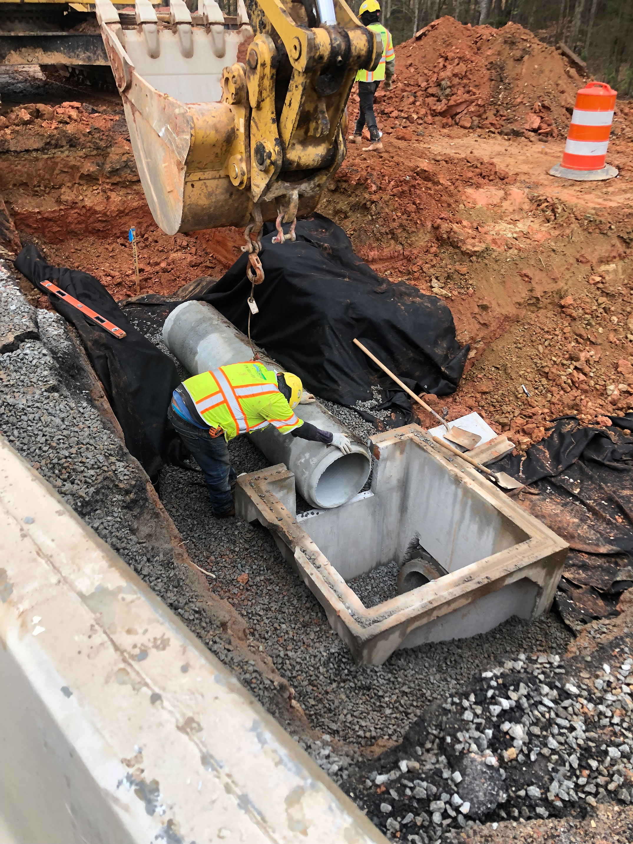 Catch basins are designed to connect the drainage systems and route the stormwater to an outlet. Here crews are connecting perpendicular lines using a precast catch basin.