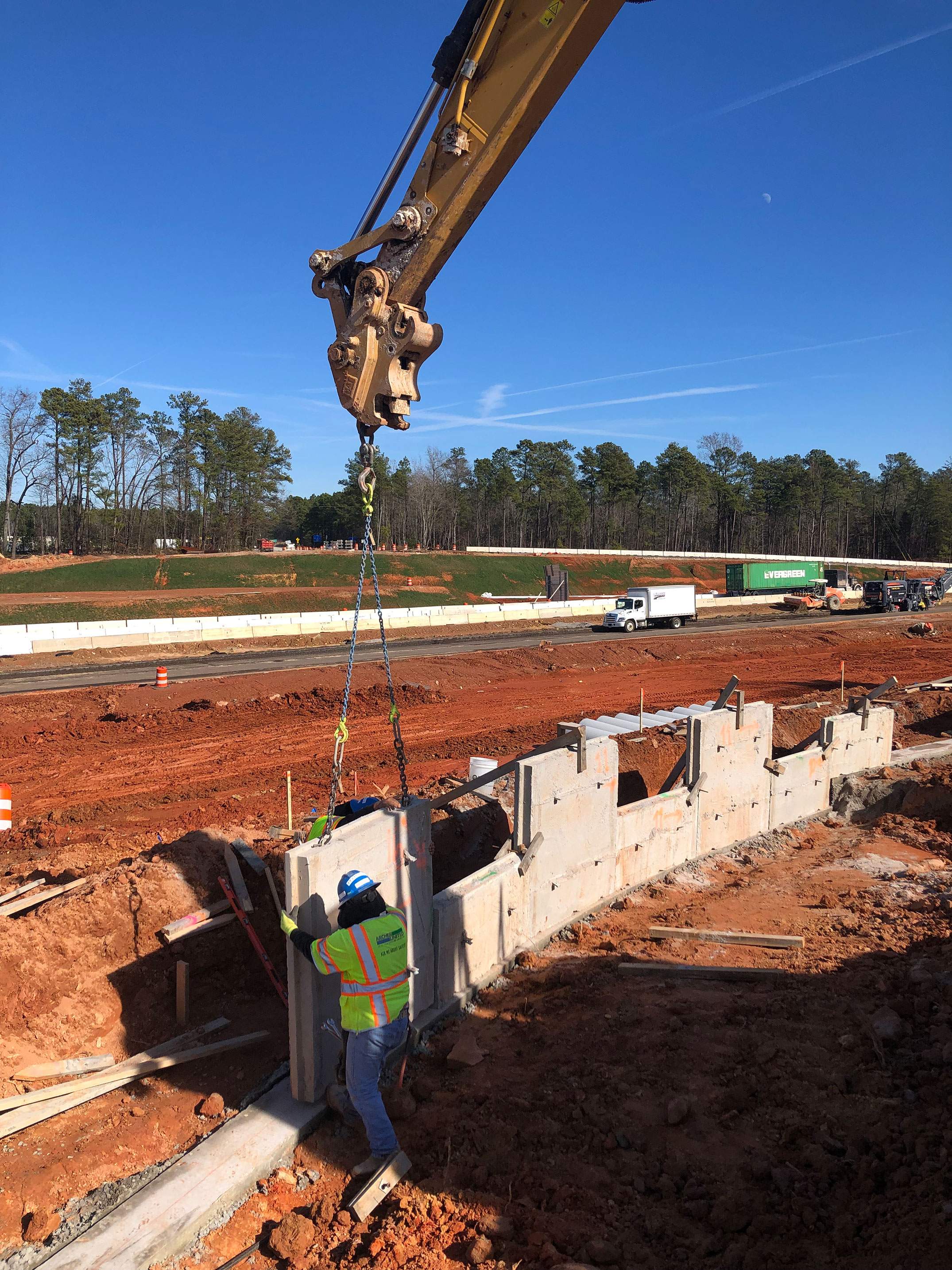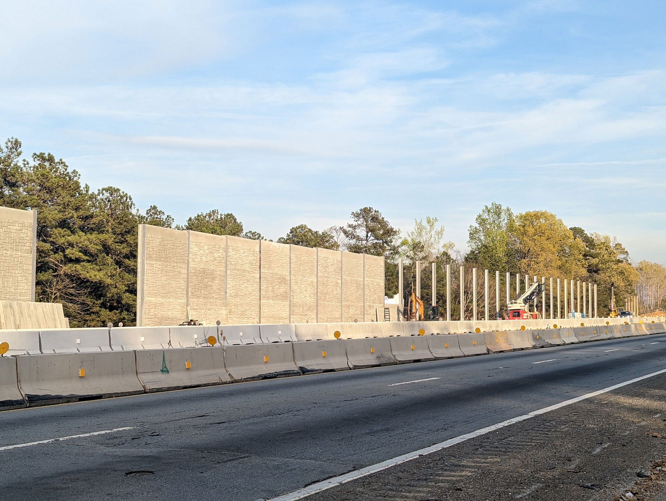 Much progress has been made on the I-26 Westbound sound barrier wall. The concrete panels are dropped into place between two steel I-beams that are set in a solid concrete foundation. Some sections of the wall reach 30’ high!