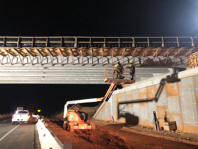 In this photo, crews are working on the Koon Road overpass bridge MSE wall on the Eastbound side. This is located in segment 1 of construction.