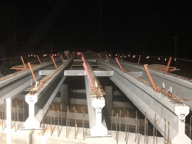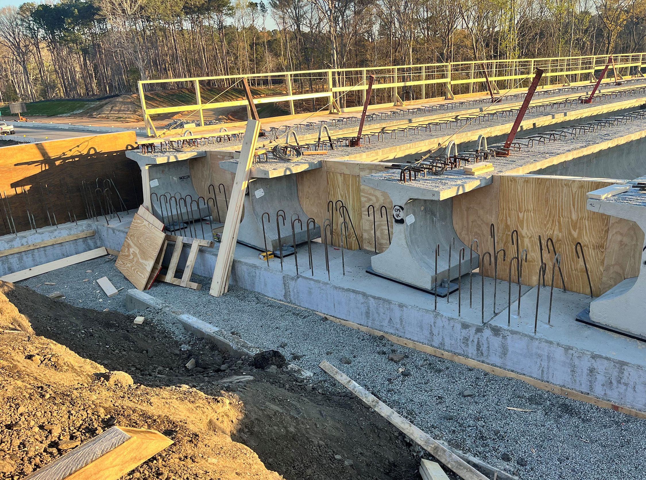This picture shows the beams for the new overpass bridge at Exit 91. These beams were manufactured in Wilmington, North Carolina. Each beam is 45” tall and 86’ long.