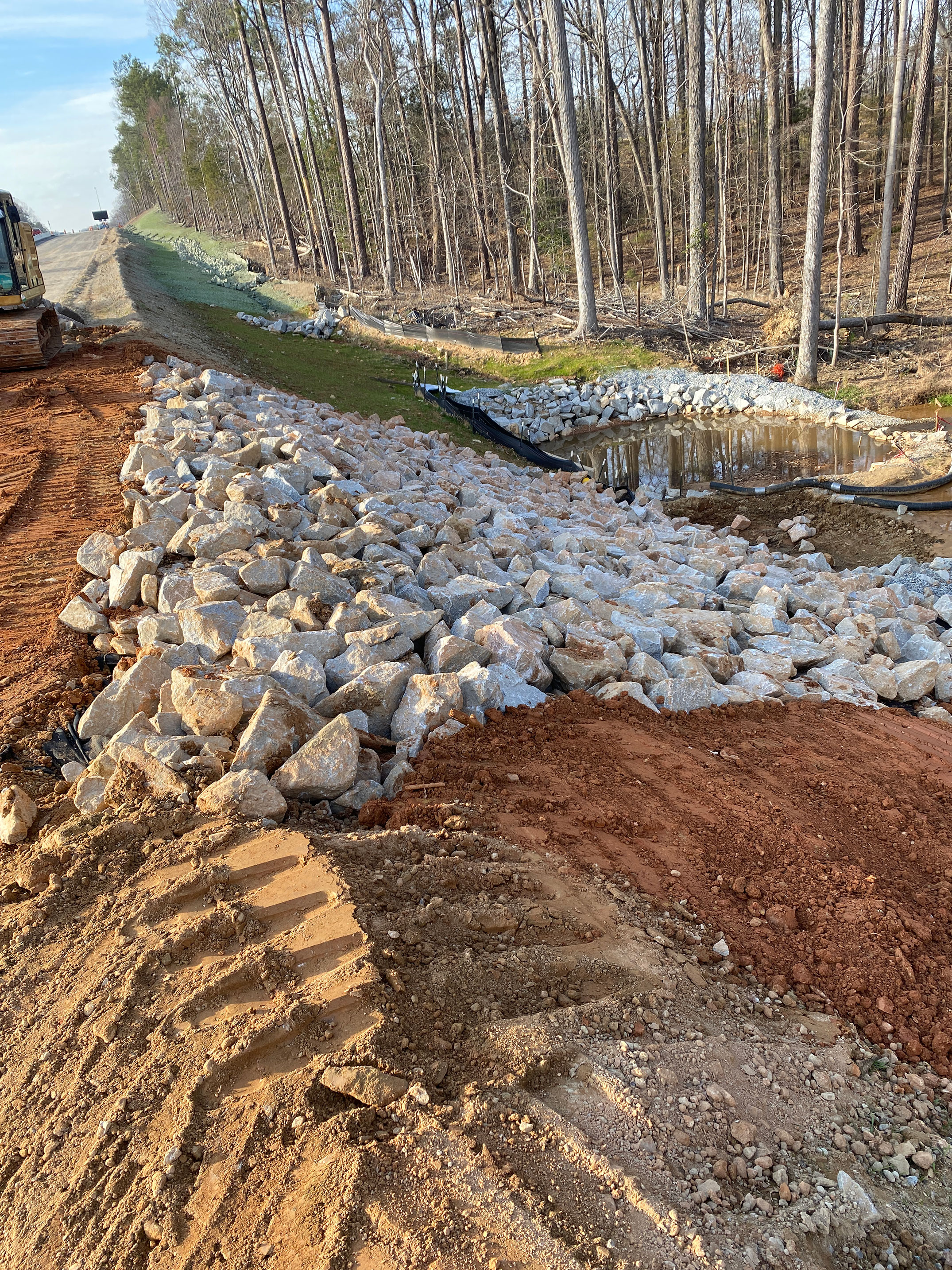 The contractor uses rock called “rip rap” to stabilize the slopes and to trap eroded sediment within the project limits.
