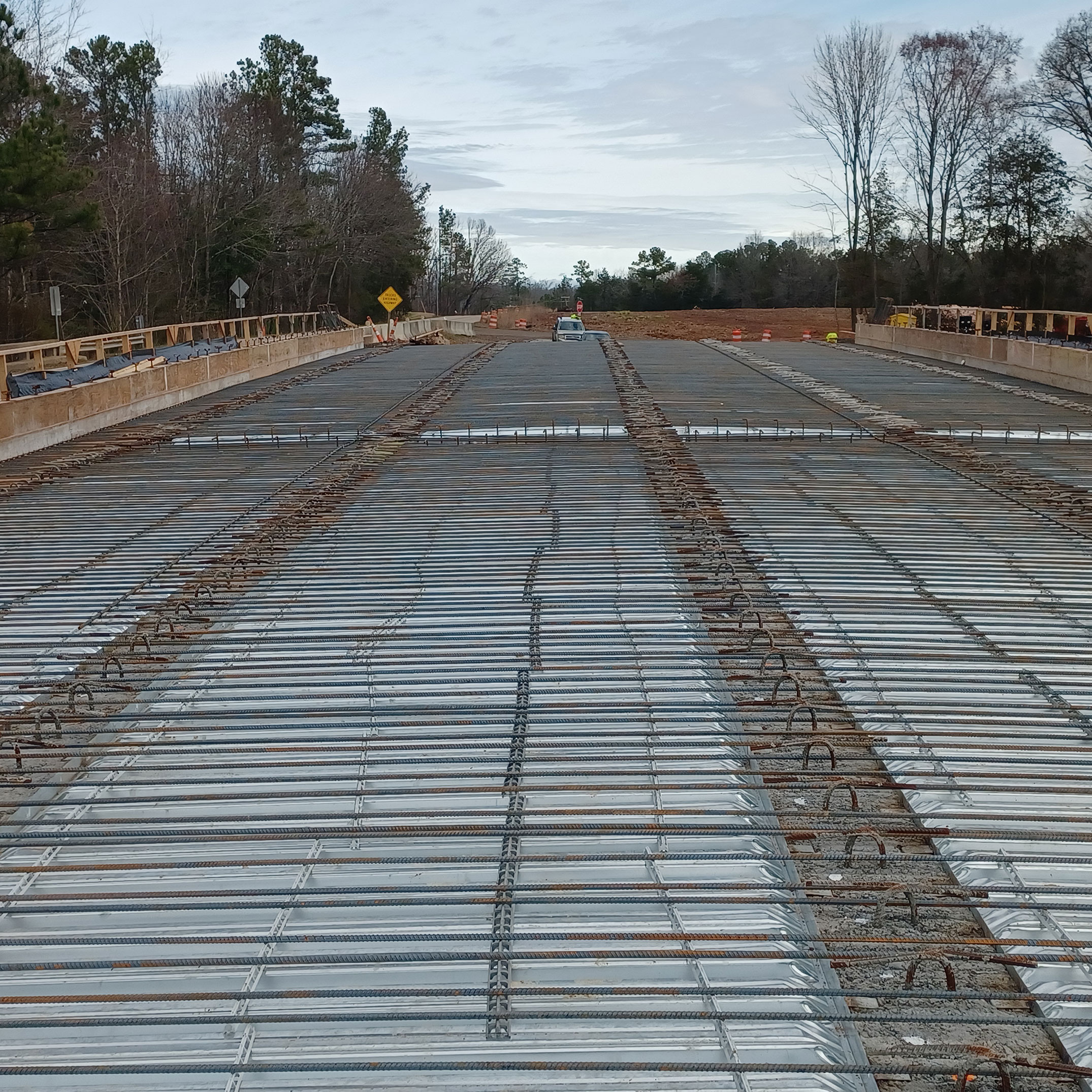 The contractor has started to place the reinforcing steel on the bridge deck of the new bridge on Mount Vernon Church Road over I-26. Over 69,000 lbs of steel will be placed in this bridge deck before concrete can be placed.