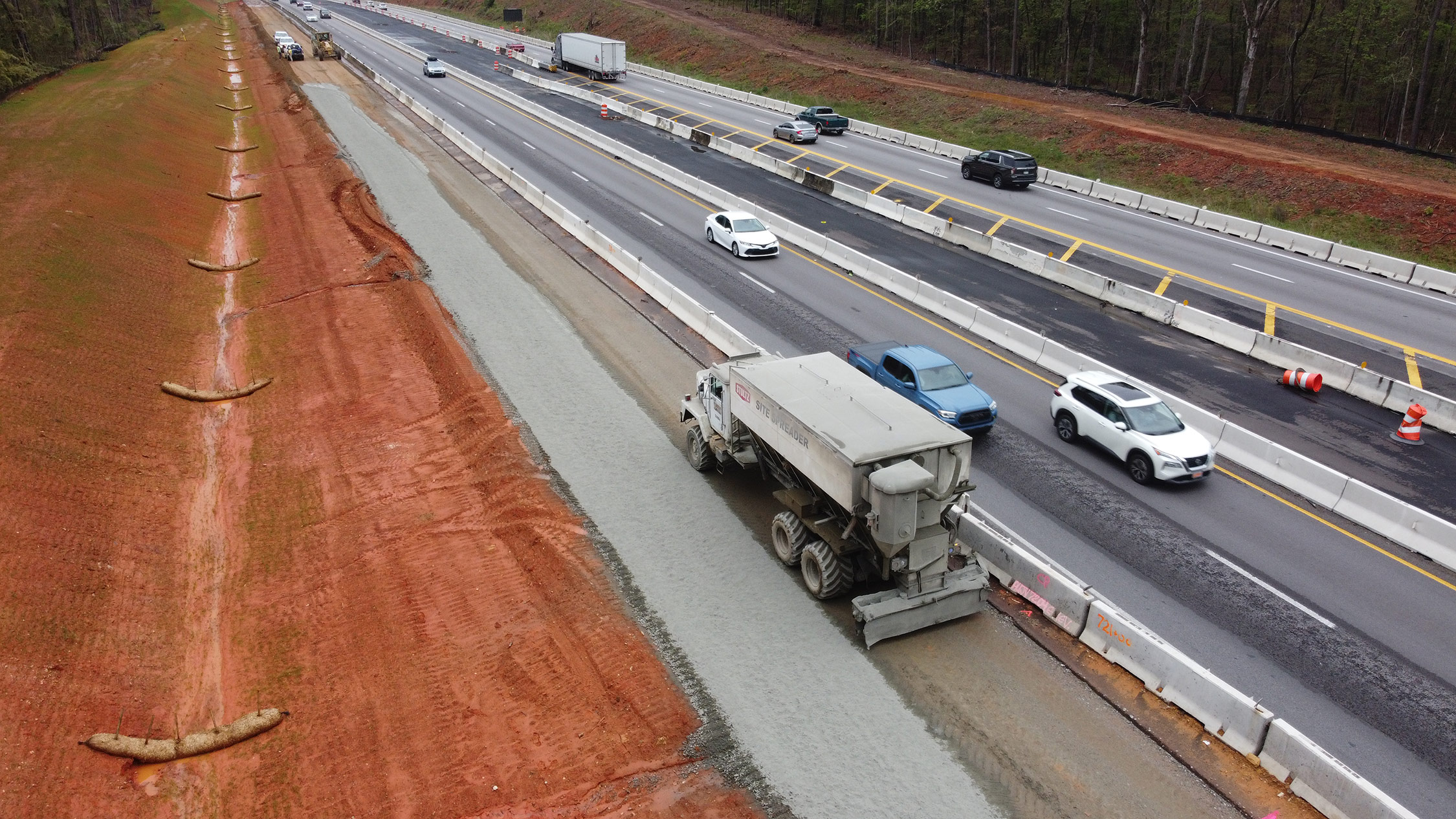 This photo shows the contractor preparing the base for future travel lanes by spreading a layer of cement that is mixed with soil to prepare a solid surface for the pavement structure. This will allow traffic to be shifted to the outside as a part of the staged interstate widening. Upcoming traffic shifts are planned on the westbound lanes between Koon Road and Exit 97.