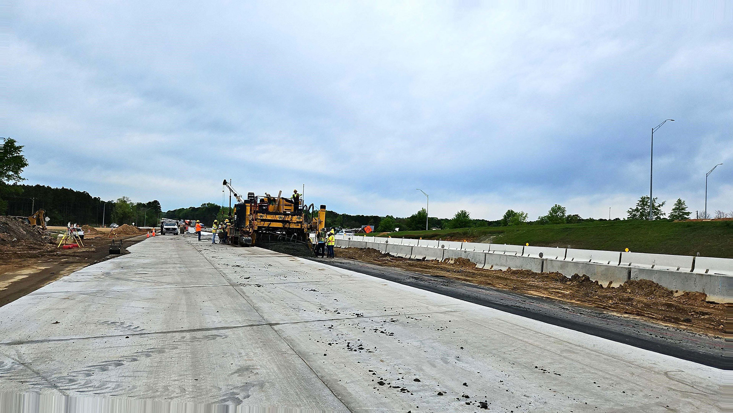 The paving crew continues placement of new travel lanes on I-26 near the Peak exit. This single lane paver rides along the top of the new pavement on one side and the top of the subbase on the other side.